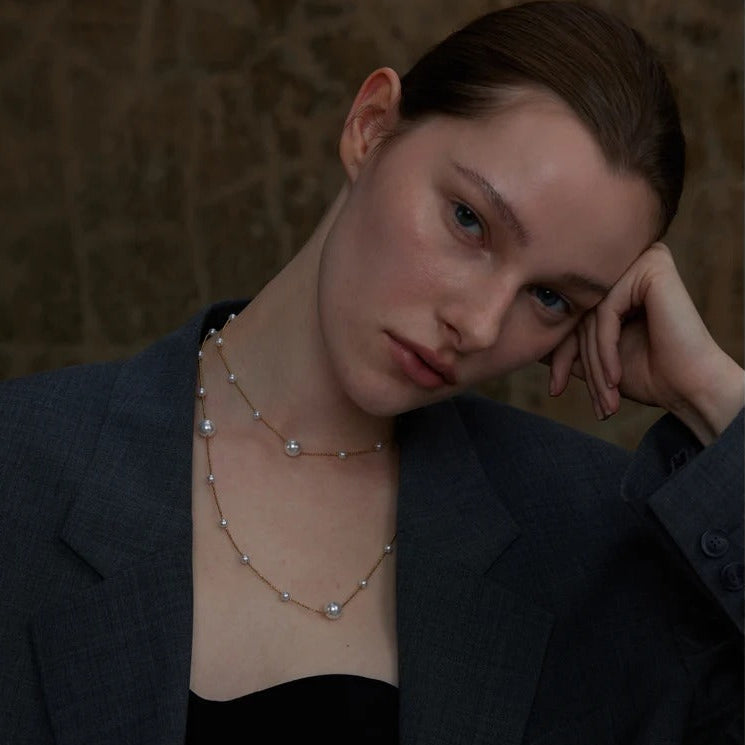 Chaque perle reflète la lumière avec douceur, offrant un rendu raffiné et harmonieux, parfait pour rehausser aussi bien une tenue de soirée qu’un look quotidien.